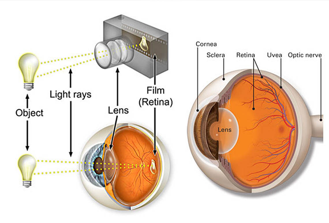 The eye can be compared to a sophisticated camera, where the lens functions to transmit light, enabling it to converge onto the delicate and intricate retina positioned at the posterior part of the eye. This remarkable process resembles capturing an image on a thin, intricate film, allowing us to perceive the world around us.